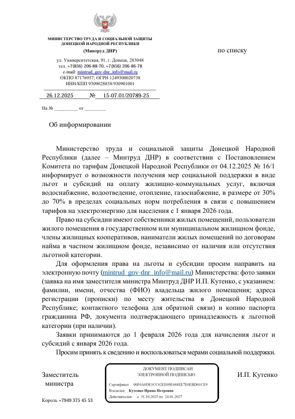 Министерство труда и социальной защиты Донецкой Народной Республики распространило официальное письмо, в котором объявило о новых мерах поддержки населения на оплату коммунальных услуг. Документ датирован 26 декабря и подписан заместителем министра И.П. Кутенко. Эти меры напрямую связаны с предстоящим повышением тарифов на электроэнергию с 1 января 2026 года.
