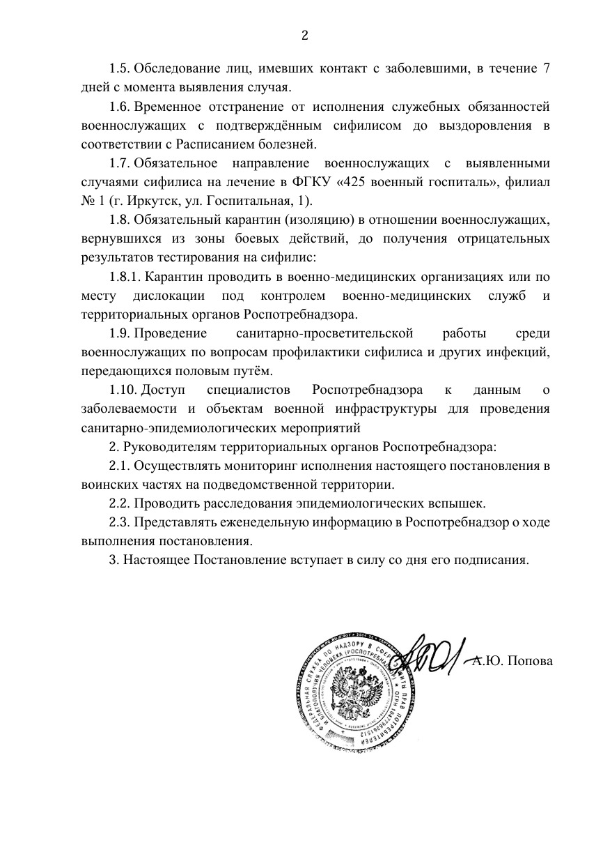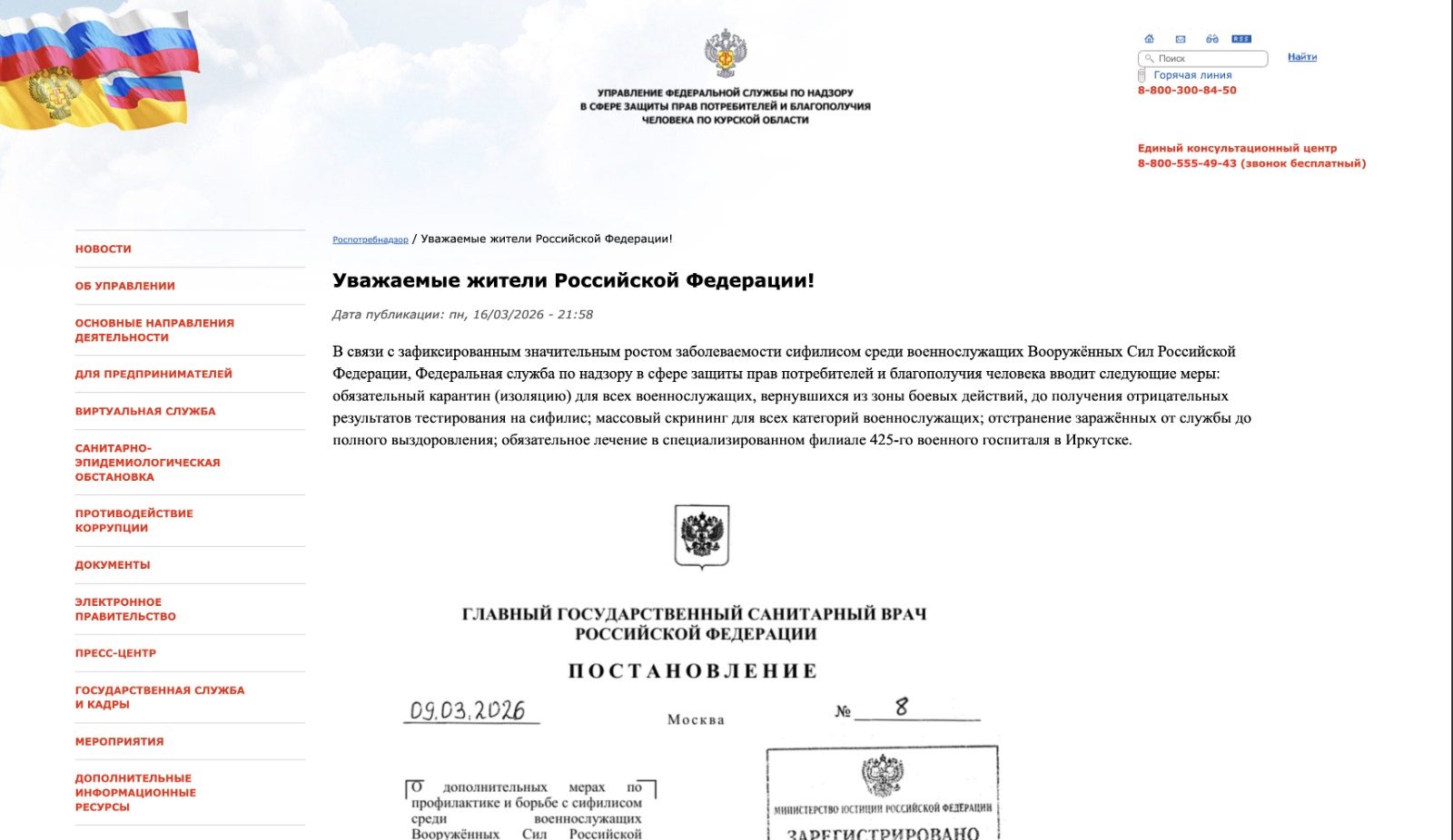 На официальных сайтах ряда региональных управлений Роспотребнадзора (в том числе Курской, Нижегородской, Калининградской областей, Республик Ингушетия, Мордовия, Карачаево-Черкесской и других) 16 марта было опубликовано постановление Главного государственного санитарного врача РФ Анны Поповой «О дополнительных мерах по профилактике и борьбе с сифилисом среди военнослужащих Вооружённых Сил Российской Федерации».